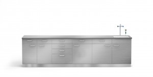 The worktop of the table can be produced from various materials, it may be equipped with sinks, mixers, fittings, distributing media wall. The space under the worktop can be filled with construction,