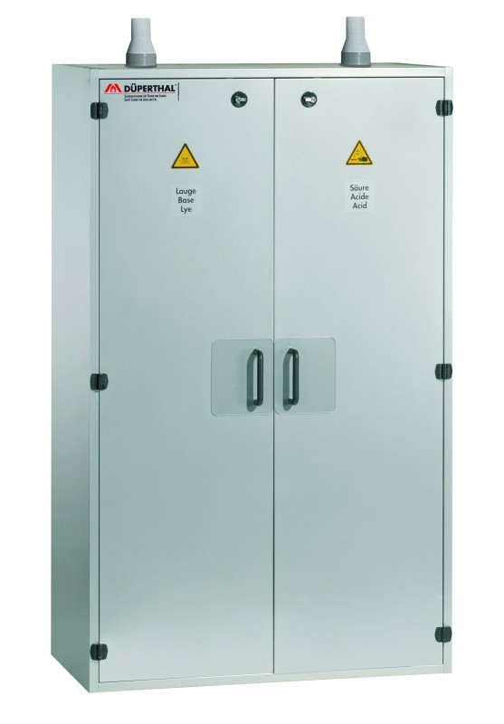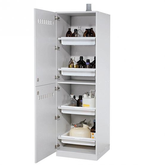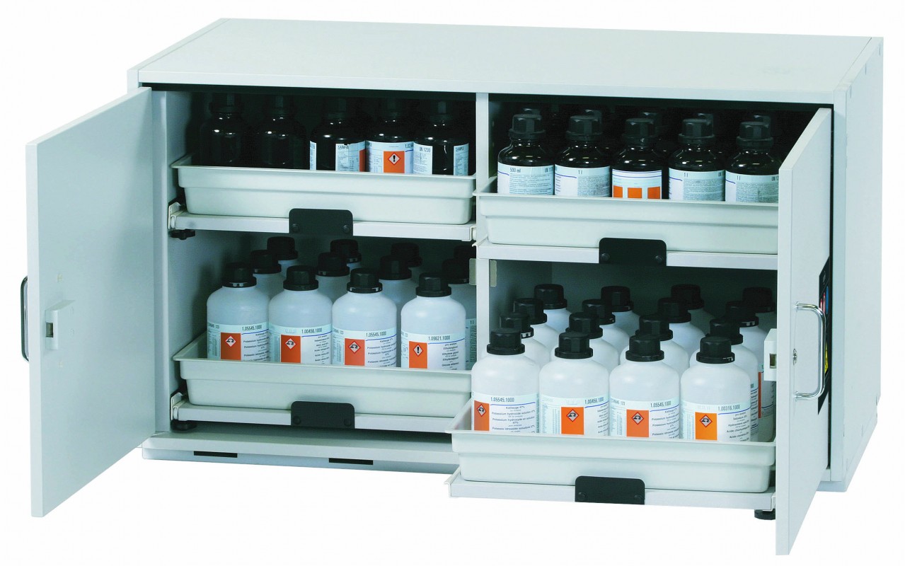 Safety cabinets for acids and alkalis are used for safe storage of aggressive chemicals according to regulations. They must not be used for storage of inflammable liquids.