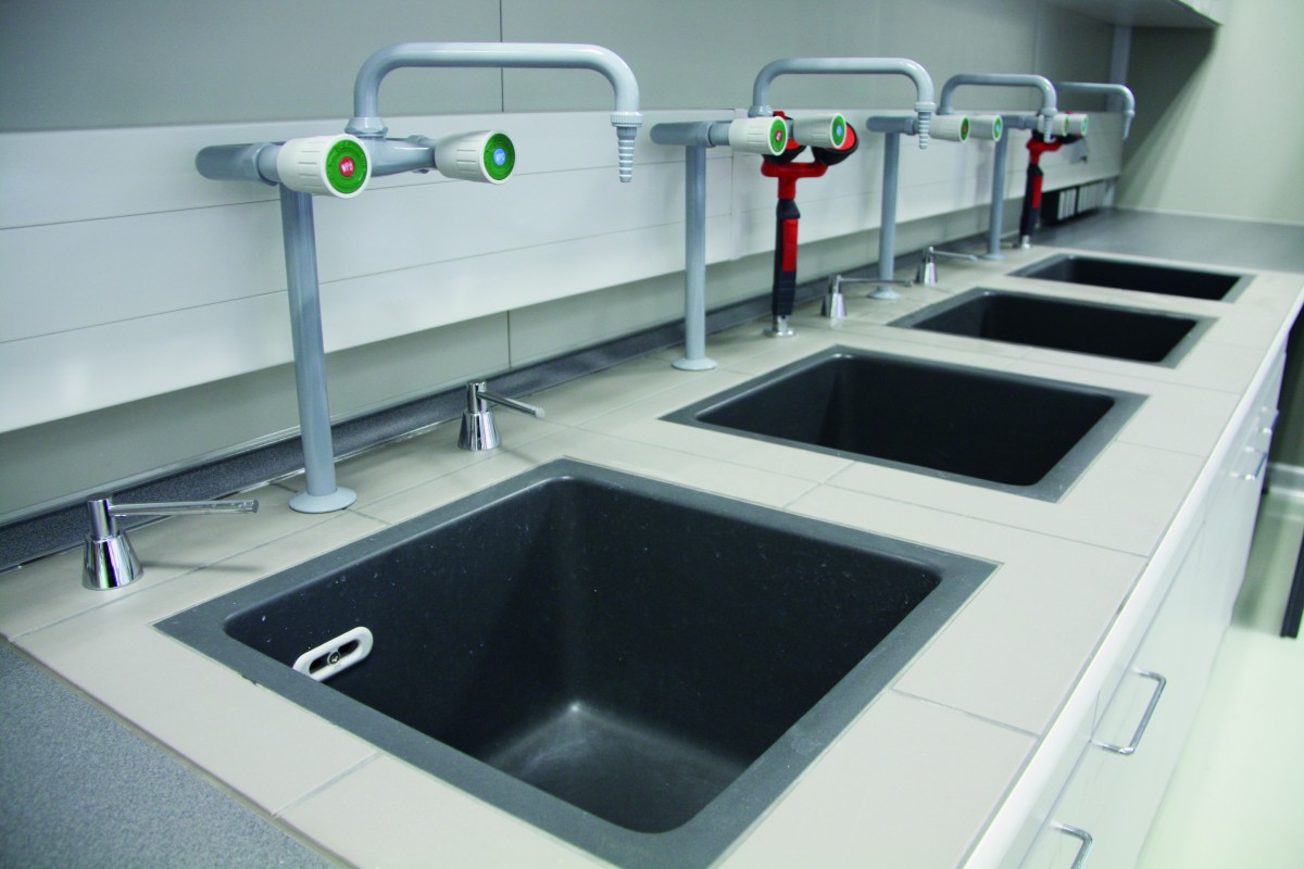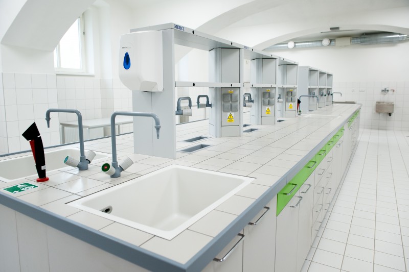VALVES. Laboratory tables MERCI® are fitted with worktops with necessary chemical, mechanical and heat resistance. For special applications, we offer worktops with raised edges, integrated sink or antibacterial finishing.