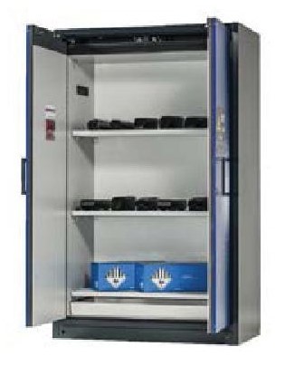 Safety cabinet for storing batteries with a 90-minute resistance, both in the case of fire from the outside according to ÄŒSN EN 14470-1, and in case of fire from the inside due to self-ignition of batteries according to EN 1363-1. Inside, the cabinet is equipped with a smoke detector and a temperature sensor, which will trigger visual and acoustic alarms in the event of a fire inside. The cabinet can be easily loaded onto the fork of a trolley and moved (even in the event of a fire indication inside the cabinet). The color design is an anthracite body (RAL 7016) with dark blue doors (RAL 5010). The internal equipment consists of four perforated shelves and a catch basin, other variants and dimensions are available on request.