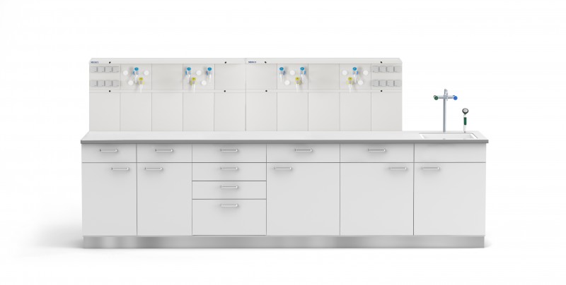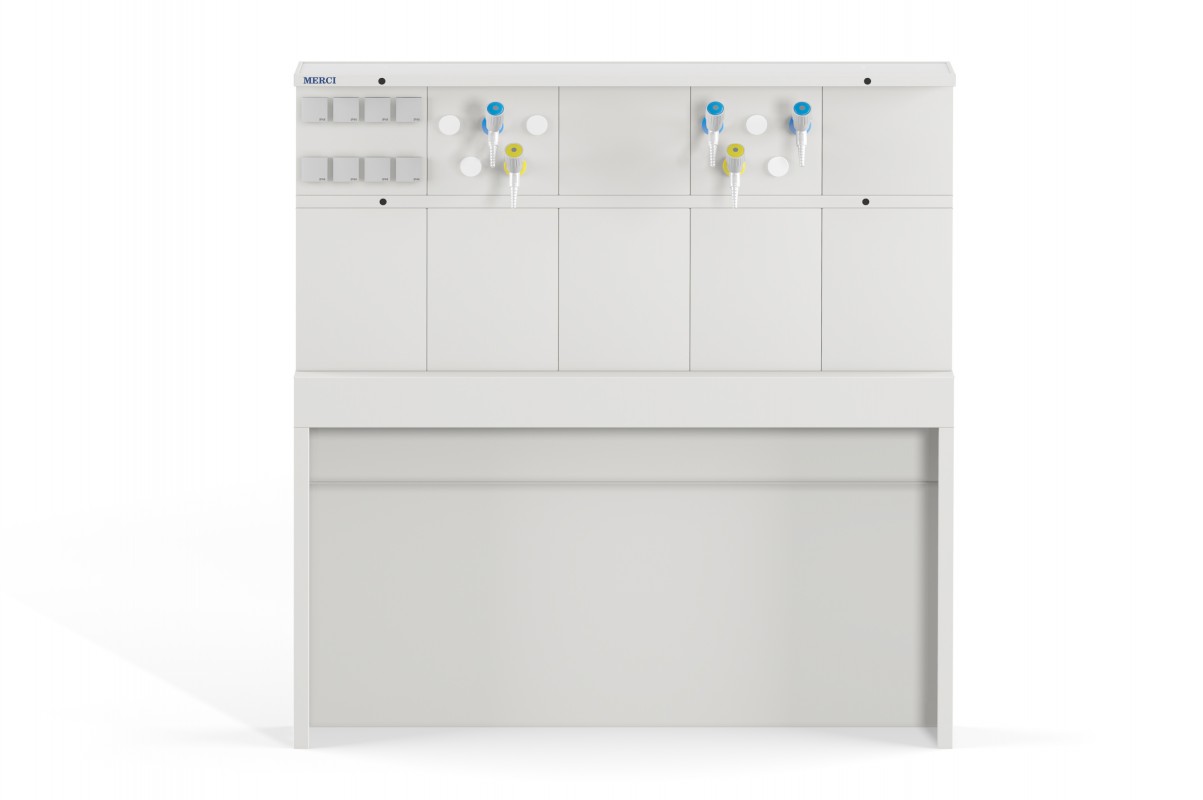 Service cells MERCI® G can be equipped with valves and outlets of gas media inclusive electro installation, main switches, emergency switches or data sockets, local exhaust, LED lighting of the worktop or with elements for installing of apparatuses.