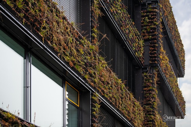The pavilion is designed to face the challenges of climate change. Its green facades and low-energy roofs are a significant contribution to climate change adaptation and demonstrate how educational institutions can contribute to environmental protection.