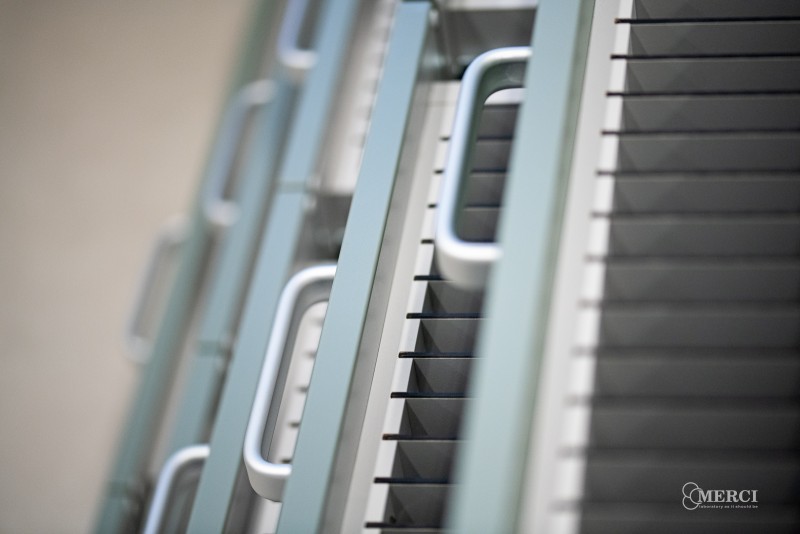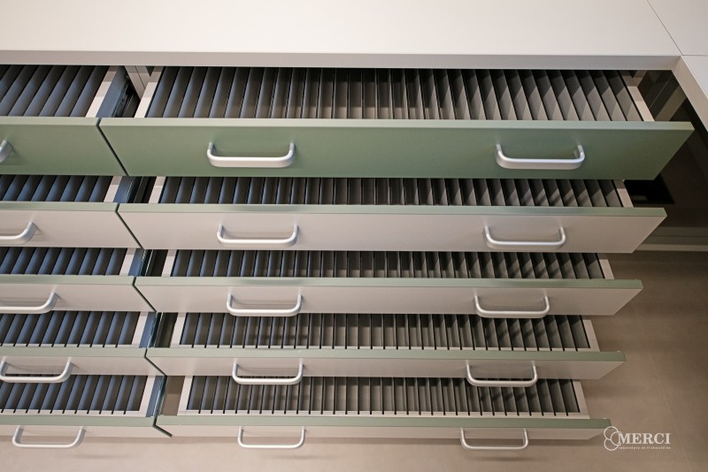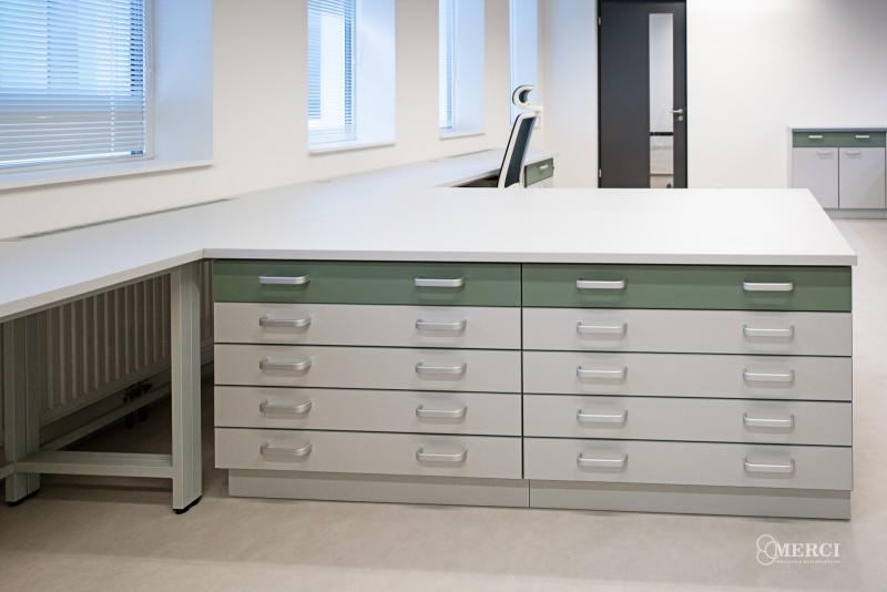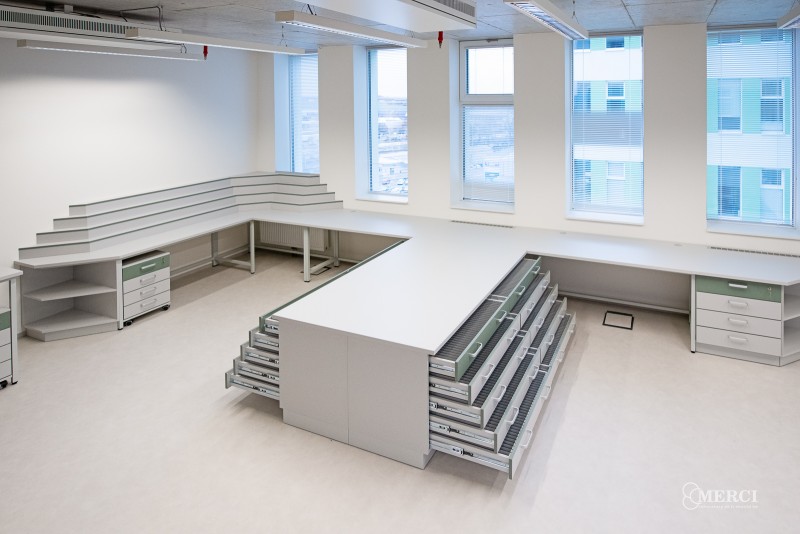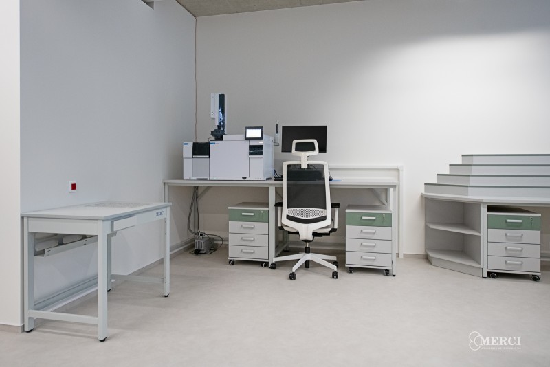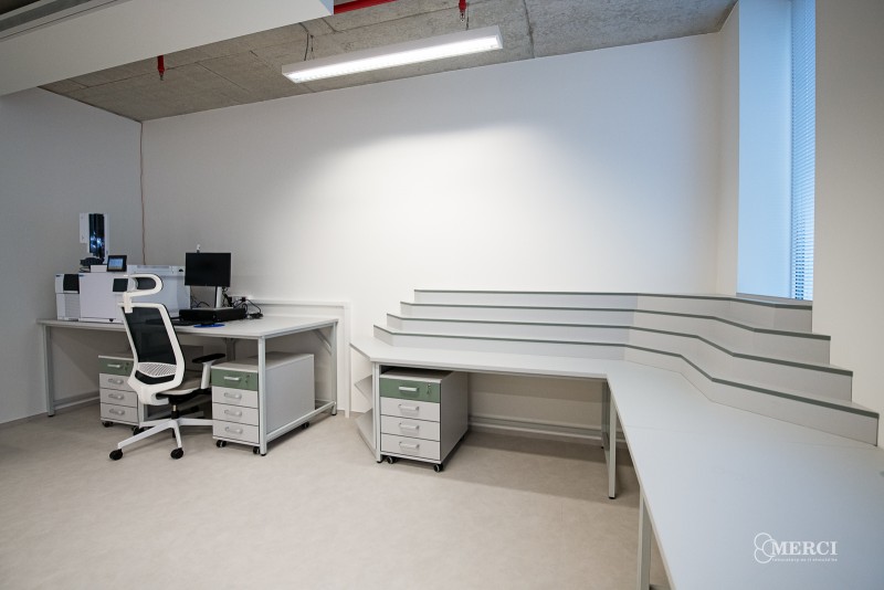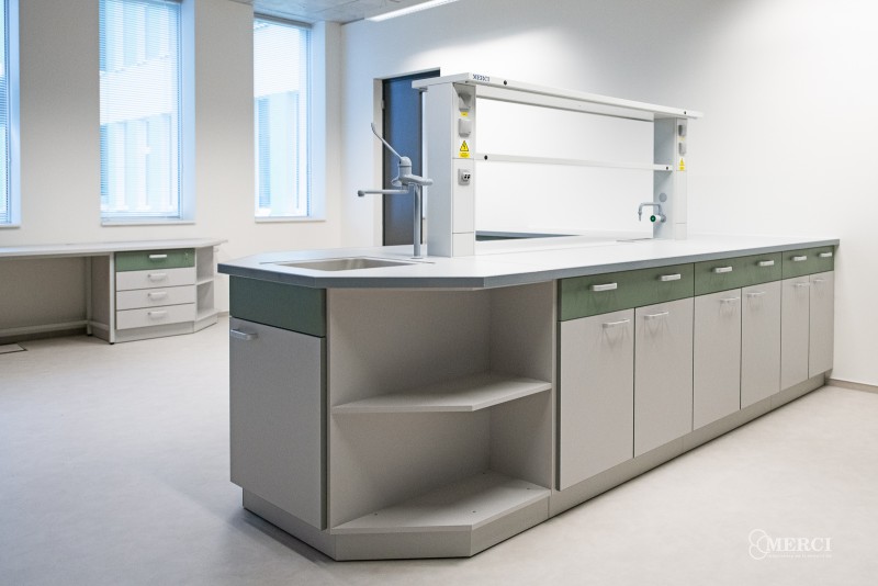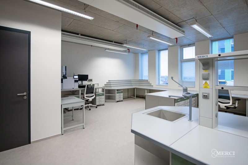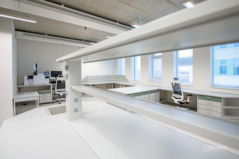 An efficient layout of work surfaces and laboratory furniture promotes ergonomics and a smooth workflow. LED lighting and large windows ensure plenty of natural light, while the modular furniture setup allows for rapid adjustments according to the lab’s changing needs.