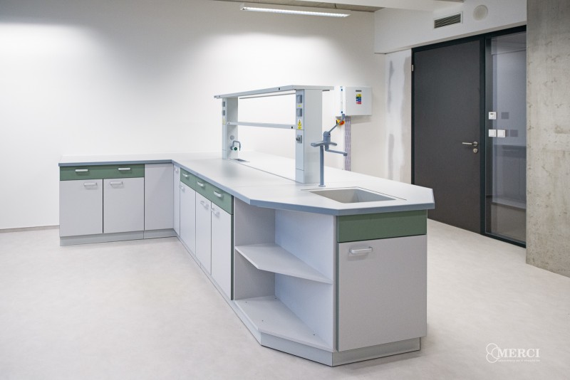 This central element of the laboratory is connected to water, electricity, and other media, simplifying the handling of samples and instruments. An integrated sink and faucet provide quick rinsing and solution preparation, while the surrounding work surface offers ample space for all necessary tasks.